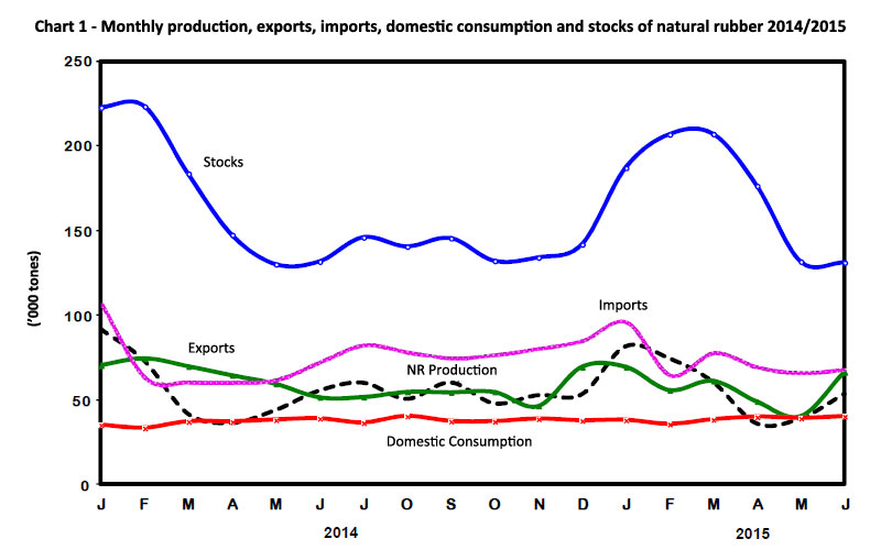 The level of NR stocks was recorded at 131,136 tonnes at the end of June 2015, dropped by 543 tonnes (-0.4%) as compared to May 2015. NR stocks also dropped by 1,164 tonnes (-0.9%) when compared to the level of stocks a year ago.