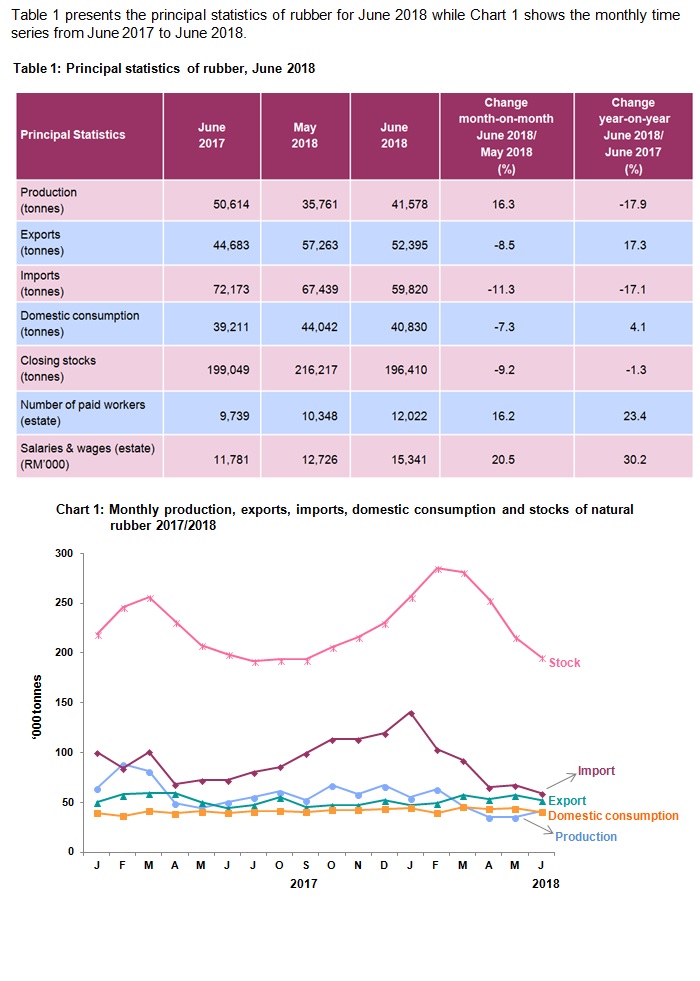 Natural rubber production in June 2018 surged by 16.3 per cent to 41,578 tonnes as compared to May 2018 of 35,761 tonnes. For year-on-year, the production decreased by 17.9 per cent.
