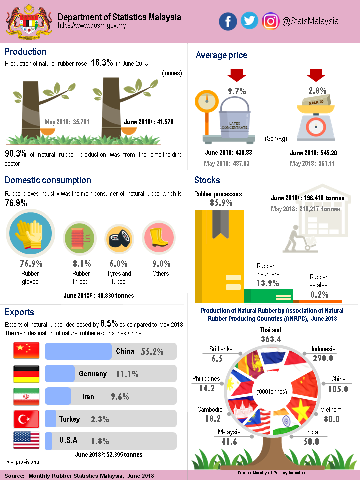 Domestic consumption of natural rubber in June 2018 shrank at 7.3 per cent to 40,830 tonnes. The rubber glove industry uses 31,391 tonnes or 76.9 per cent of the total domestic consumption of natural rubber.