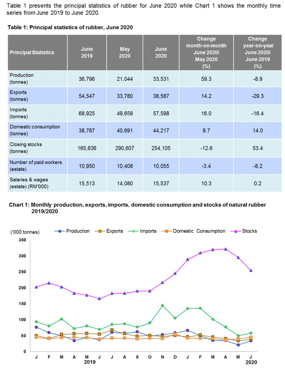 Production of natural rubber increased 59.3 per cent in June 2020 to 33,531 tonnes as compared to 21,044 tonnes in the previous month. Comparison year on year showed a decrease of 8.9 per cent as compared to the same month in the previous year.