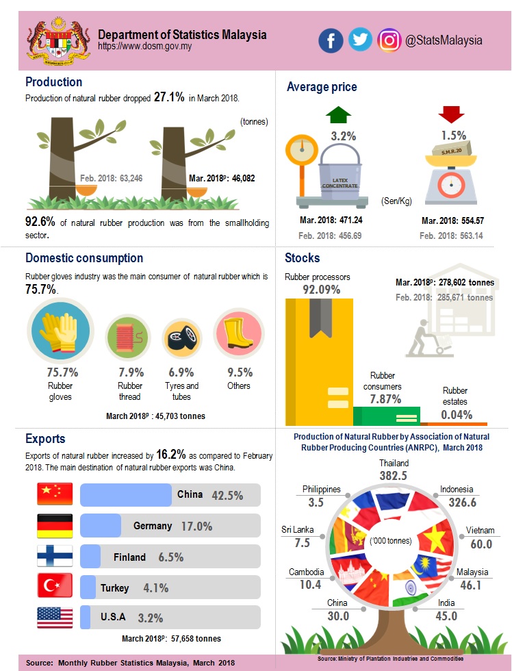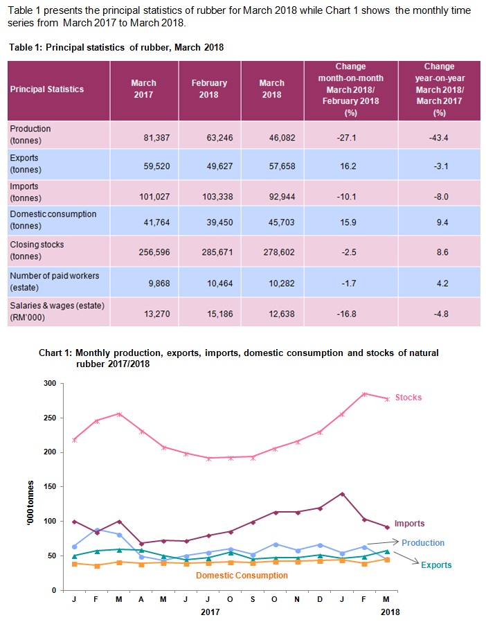 Natural rubber production in March 2018 was 46,082 tonnes, dropped by 27.1 per cent as compared to 63,246 tonnes in February 2018. For year-on-year, the production also showed a decrease of 43.4 per cent.