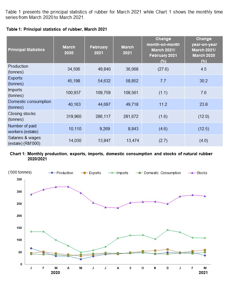The full publication of the Monthly Rubber Statistics, March 2021 can be downloaded through eStatistik Portal.