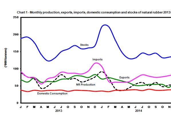 In November 2014, imports of NR amounted to 80,457 tonnes, increased by 3,596 tonnes (+4.7%) from a month ago but fell 13,497 tonnes (-14.4%) from a year ago. Standard Rubber was the main type of rubber imported at 35.0 per cent of total imports.