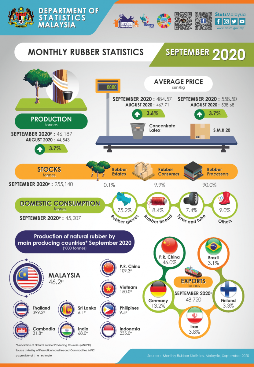 Production of natural rubber increased 3.7 per cent in September 2020 to 46,187 tonnes as compared to 44,543 tonnes in the previous month. Meanwhile, compared to the same month in the previous year, it recorded a decrease of 25.2 per cent.
