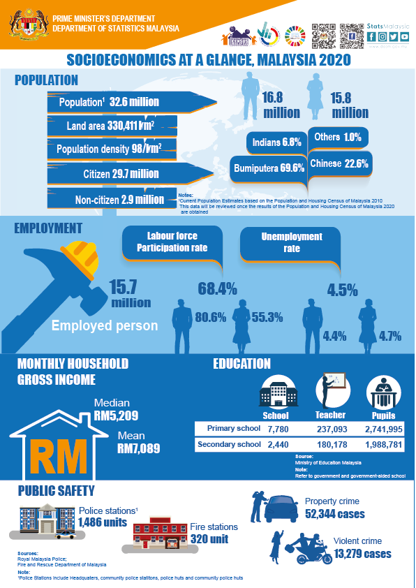 My Local Stats 2020, the fourth series since 2017. This year, My Local Stats publication is released for all 156 administrative districts. Apart from that, it also publishes one publication for the whole country, 13 publications by states and three publications by Federal Territory. This publication provides the statistics needed for sustainable development planning. It integrates economic and social statistics at the administrative district level for the 2018 to 2020 time series.