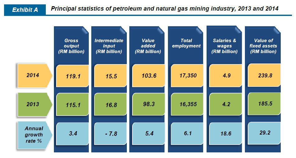 The principal statistics of the petroleum and natural gas mining industry in Malaysia for reference year 2013 and 2014 are illustrated in Exhibit A.