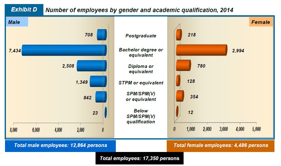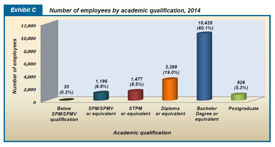 The number of employees by academic qualification indicates that employees with Bachelor Degree contributed the highest percentage share accounted for 60.1 per cent (10,428 persons), followed by Diploma or equivalent (19.0%) and STPM or equivalent (8.5%) as shown in Exhibit C.