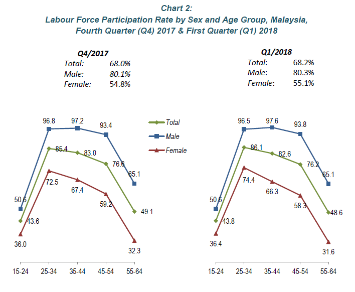 Male LFPR also increased to 80.3 per cent in the first quarter 2018. Male LFPR in the labour market for age group 35-44 and 45-54 years recorded an increase of 0.4 percentage points to 97.6 and 93.8 per cent respectively. Overall, male LFPR remained consistently higher than female for all age groups.