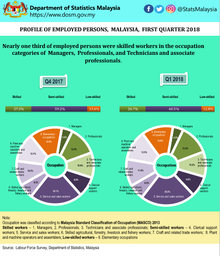 The detailed information and technical notes are published in the Labour Force Survey Report, Malaysia, First Quarter 2018. This report is accessible and downloadable free of charge through the eStatisik application in DOSM web page, www.dosm.gov.my.