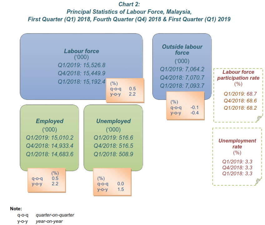 Labour force in Malaysia increased 2.2 per cent as compared to the first quarter of 2018 to 15.53 million persons. The employed persons also recorded an increase of 2.2 per cent in the same period to 15.01 million persons.