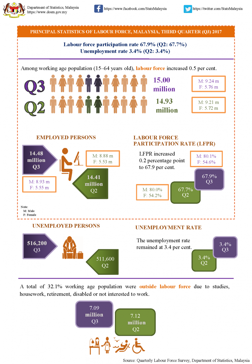 Labour force in Malaysia increased 0.5 per cent to 15.00 million persons in third quarter 2017 compared to 14.93 million persons in the previous quarter. The rise was contributed by the increase of 69,200 employed persons to 14.48 million persons as well as the increase of 4,600 unemployed persons to 516.2 thousand persons.