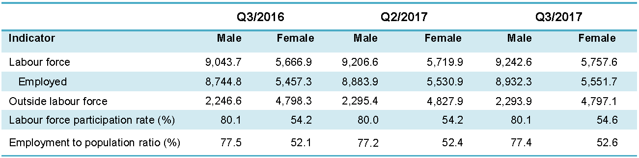 In third quarter 2017, 38.4 per cent females were in the labour market with an increase of 0.1 percentage point (37,900 persons) to 5.76 million persons compared to 5.72 million persons in second quarter 2017.