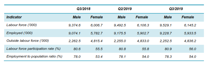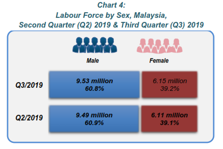 In the third quarter of 2019, the labour force was represented by 60.8 per cent male (9.53 million) and 39.2 per cent female (6.15 million). The number of labour force for both male and female increased by 36,600 persons and 38,900 persons respectively as compared to the second quarter of 2019.