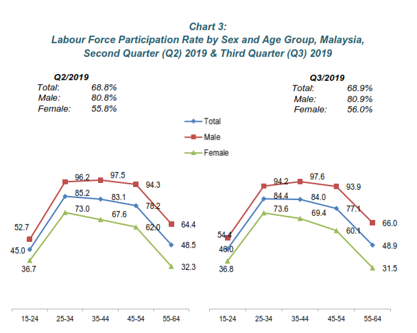Male LFPR in this quarter increased by 0.1 percentage points to 80.9 per cent in this quarter as compared to second quarter 2019. The age group that recorded more than 90 per cent of LFPR were 25-34 years (94.2%), 35-44 years (97.6%) and 45-54 years (93.9%) (Chart 3).