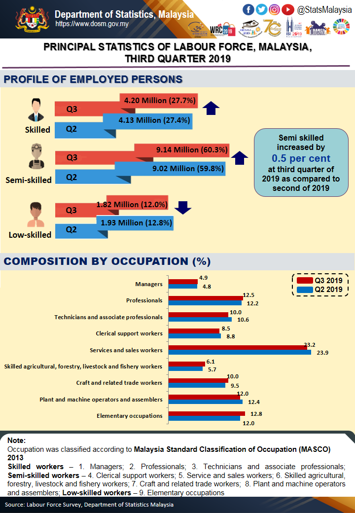 Labour force and employed persons in Malaysia recorded a growth of 1.9 per cent and 2.1 per cent as compared to the third quarter of 2018 to 15.67 million persons and 15.16 million persons respectively.