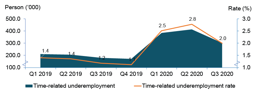 For a series of Q1 2019 to Q4 2019, the time-related underemployment averaged of 1.4 per cent from the total of employed persons equivalent to 212.4 thousand persons. The implementation of MCO in the mid of March 2020 has caused the number increased further to 383.2 thousand persons (2.5%) in Q1 2020. Subsequently, the continuous phases of MCO and several economic activities were allowed to operate with strict standard operating procedure in Q2 2020, led to the increase in time-related underemployment to 413.5 thousand persons (2.8%). Nevertheless, the number reduced to 300.8 thousand persons (2.0%) in Q3 2020 following the implementation of Recovery MCO with longer business operation hour during the period. [Exhibit 10]