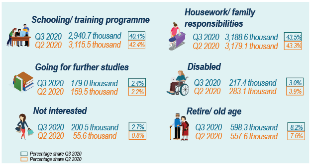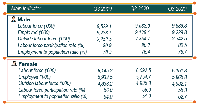 Labour force increased 1.1 per cent t o 15.84 million persons while employed persons decreased by 0.4 per cent to 15.10 million persons as compared to the third quarter of 2019. Quarter-on-quarter, labour force and employed persons inclined 1.1 per cent and 1.4 per cent respectively as against previous quarter. Labour force participation rate (LFPR) in the third quarter of 2020 rose 0.3 percentage points to 68.4 per cent from 68.1 per cent in second quarter of 2020. The employment-to-population ratio increased by 0.6 per cent to 65.2 per cent as compared to second quarter 2020. Meanwhile during this quarter outside as labour force stood at 31.6 per cent.