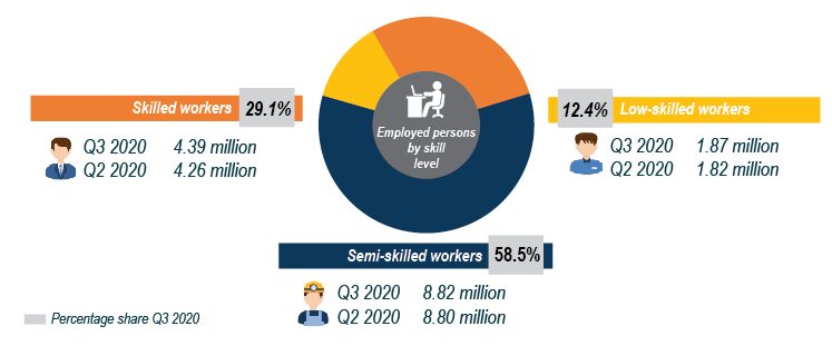 The semi-skilled workers dominated the labour market by 58.5 per cent followed by skilled workers (29.1%) and low-skilled workers (12.4%) in the third quarter of 2020. The number of skilled workers increased by 132.0 thousand persons to 4.39 million persons as compared to 4.26 million persons in the second quarter of 2020. Meanwhile, the composition of low-skilled workers also increased from 12.3 per cent in second quarter of 2020 to 12.4 per cent in third quarter of 2020. [Exhibit 8]