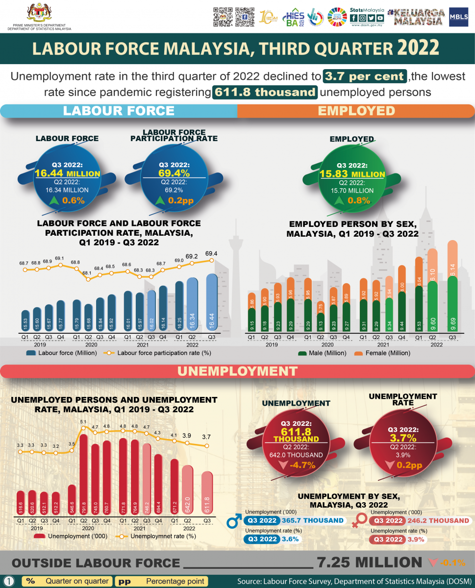 - During this quarter, the number of unemployed persons continued to decline with a reduction of 30.2 thousand persons or equivalent to negative 4.7 per cent to 611.8 thousand persons (Q2 2022: 642.0 thousand persons). Consequently, a lower unemployment rate was recorded in the third quarter of 2022 at 3.7 per cent as against in the previous quarter (3.9%).