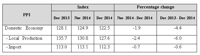The PPI for domestic economy in December 2014 decreased by 1.9 per cent with the both PPI for local production and import price index were moved down by 2.4 and 0.7 per cent respectively. (Table 1).