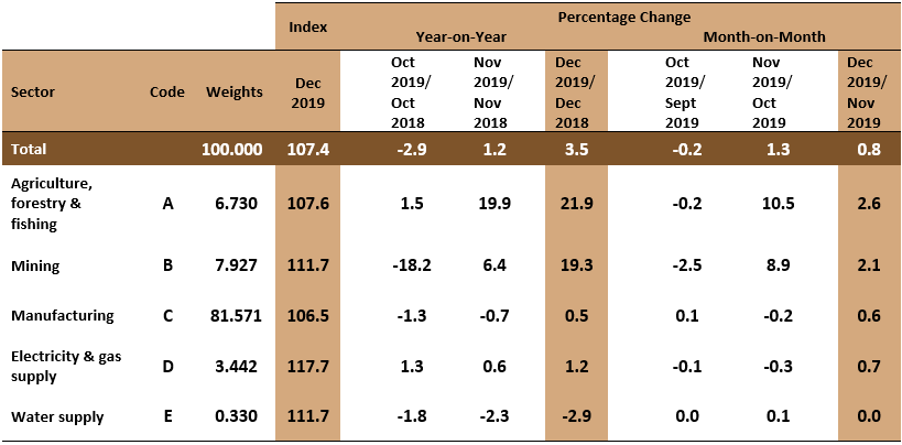 The Producer Price Index (PPI) local production increased 3.5 per cent in December 2019 to 107.4 as against 103.8 in the same month of the preceding year. The index of Agriculture, forestry & fishing and Mining recorded a double digit increase by 21.9 per cent and 19.3 per cent respectively, followed by Electricity and gas supply 1.2 per cent and Manufacturing 0.5 per cent. Conversely, the index of water supply decreased 2.9 per cent.