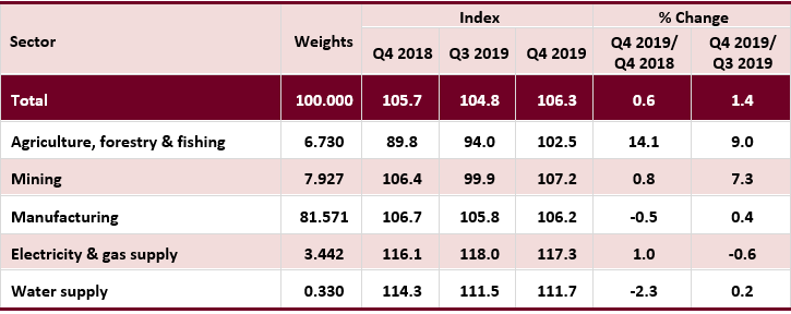 PPI local production for the fourth quarter 2019 increased 0.6 per cent to 106.3 as compared to 105.7 in the same quarter of the previous year. The increased was contributed by Agriculture, forestry & fishing (14.1%), Electricity & gas supply (1.0%) and Mining (0.8%) indices. Meanwhile, the index of Water supply and Manufacturing recorded a decrease of 2.3 per cent and 0.5 per cent respectively. On a quarterly basis, the PPI local production increased 1.4 per cent as compared to the third quarter of 2019. [Table 2]