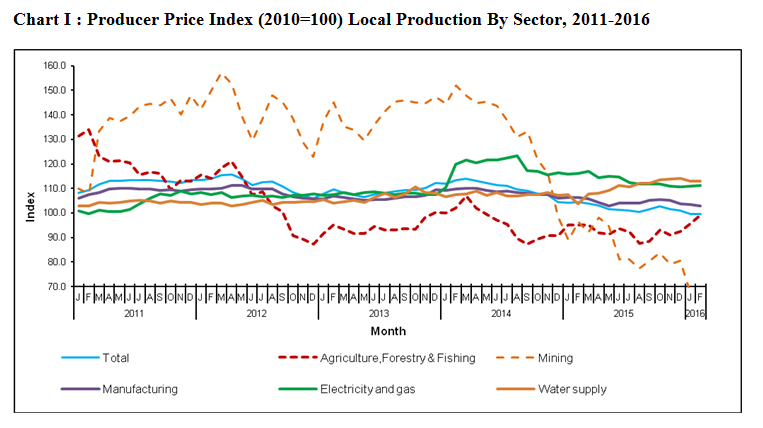The PPI for local production inclined by 0.1 per cent in February 2016 as compared to January 2016. This was due to increases in Mining (+4.2%), Agriculture, forestry & fishing (+3.3%) and Electricity & gas (+0.2%). Meanwhile, the index for Manufacturing and Water supply decreased by 0.6 per cent and 0.1 percent respectively.