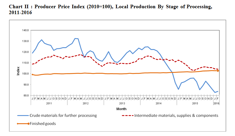 The PPI for local production by stage of processing (SOP) inclined by 0.1 per cent in February 2016 compared to the previous month. This inclination was due to an increase in Crude materials for further processing (+1.1%). However, Intermediate materials, supplies and components declined by 0.2 per cent and Finished goods remained unchanged. [Table II]