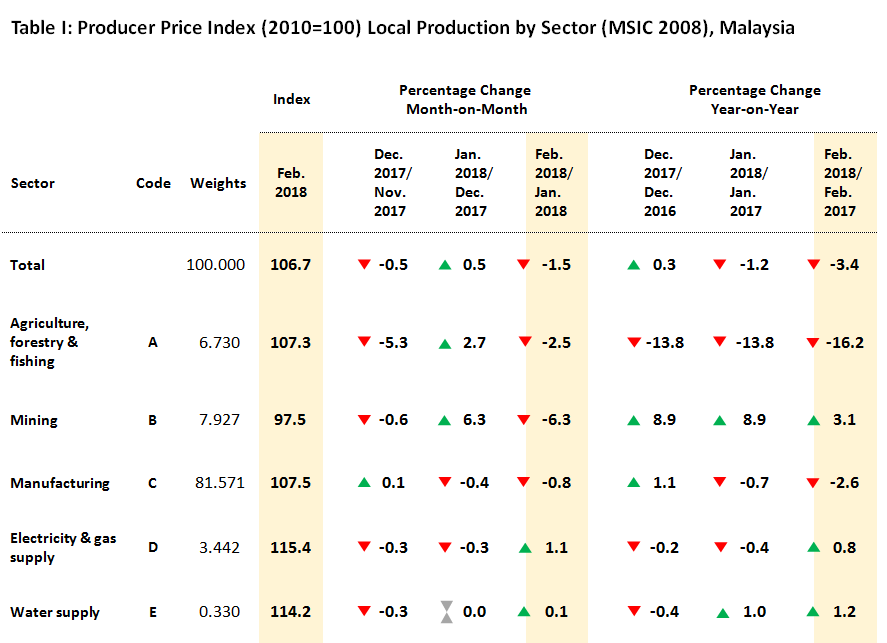 The Producer Price Index (PPI) for local production decreased 3.4 per cent on a year -on- year basis in February 2018 compared to a decrease of 1.2 per cent in January 2018. Among the sectors which decreased during this period were Agriculture, forestry & fishing (-16.2%), and Manufacturing (-2.6%). Meanwhile, the index registered increases for mining (+3.1%), Water supply (+1.2%) and Electricity & gas supply (+0.8%) sectors.