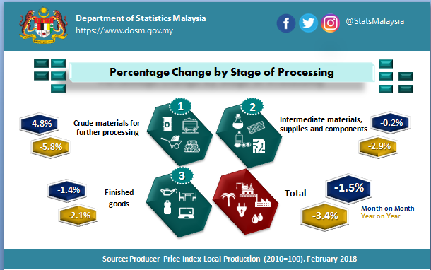 As compared with the same month a year ago, the PPI for local production by SOP for February 2018 decreased 3.4 per cent. The decreased was fuelled by the index for Crude materials for further processing (-5.8%), Intermediate materials, supplies and components (-2.9%) and Finished goods (-2.1%). [Table II].