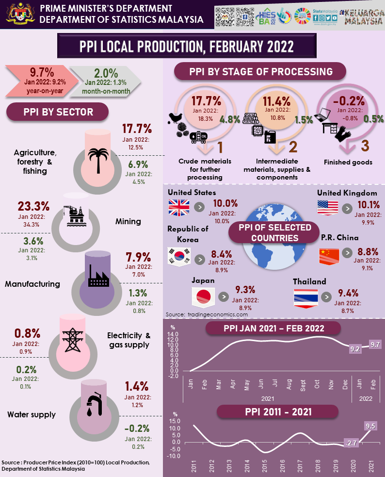 The full publication of the Producer Price Index Malaysia, February 2022 can be downloaded from eStatistik portal.