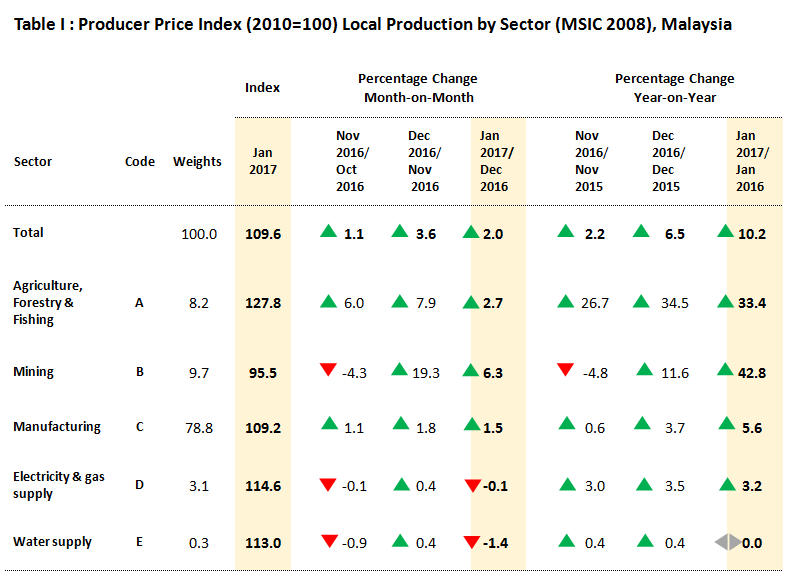 Year-on-year comparison showed that the Producer Price Index (PPI) for local production surged 10.2 per cent in January 2017. The highest increase was recorded by Mining index (+42.8%) followed by Agriculture, forestry & fishing (+33.4%), Manufacturing (+5.6%) and Electricity & gas supply (+3.2%). However, index for Water supply remained unchanged. [Table I]