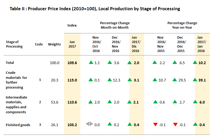 As compared with the same month a year ago, the PPI for local production by SOP for January 2017 increased by 10.2 per cent. This was due to increases in index for Crude materials for further processing (+39.1%), Intermediate materials, supplies and components (+6.0%) and Finished goods (+0.4%).