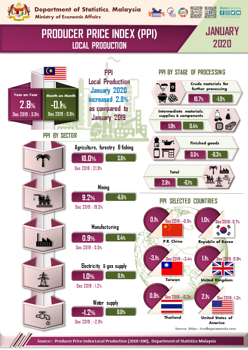 On a monthly basis, the PPI local production registered a marginal decline of 0.1 per cent in January 2020. The decrease was attributed by the decline in the index of Mining with 6.8 per cent. Conversely, the sectors which increased during this month were Agriculture, forestry & fishing (3.8%), Manufacturing (0.4%) and Electricity & gas supply (0.1%). Meanwhile, the index for Water supply was unchanged. [Table 1]