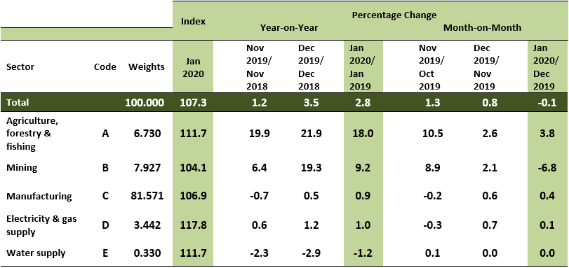 The Producer Price Index (PPI) local production rose 2.8 per cent in January 2020 to 107.3 as against 104.4 in the same month of the preceding year. The increase in the overall index was driven by the index of Agriculture, forestry & fishing (18.0%), Mining (9.2%), Electricity & gas supply (1.0%) and Manufacturing (0.9%). In contrast, the index of Water supply recorded a decline of 1.2 per cent.