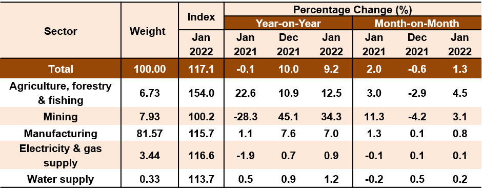 The Producer Price Index (PPI) local production which measures the costs of goods at factory gate increased 9.2 per cent in January 2022 as compared to a decrease of 0.1 per cent recorded in January 2021. The increase was lower than a 10.0 per cent year-on-year incline registered in December last year. The increase in the PPI local production in January 2022 was supported by Mining index that rose 34.3 per cent from a decline of 28.3 per cent recorded in January last year. The prices of Crude oil and Natural gas that registered an increase of 33.5 per cent and 39.0 per cent respectively contributed to the increase. The index of Agriculture, forestry & fishing increased moderately at 12.5 per cent as opposed to an increase of 22.6 per cent recorded in January 2021. The increase was due to the incline in the indices of Growing of perennial crops (14.6%) and Fishing (13.3%). Manufacturing index also registered an increase of 7.0 per cent (January 2021: 1.1%), largely due to the increase in the indices of subsectors namely Manufacture of refined petroleum products (19.2%), Manufacture of vegetable & animal oils & fats (17.0%) and Manufacture of electronic components & boards (0.4%). In addition, the indices of other subsectors such as Manufacture of basic chemicals, fertilizers & nitrogen compounds, plastics & synthetic rubber in primary forms, Manufacture of basic iron & steel and Manufacture of plastics products also inclined. Similarly, the indices of Water supply and Electricity & gas supply increased 1.2 per cent and 0.9 per cent respectively.