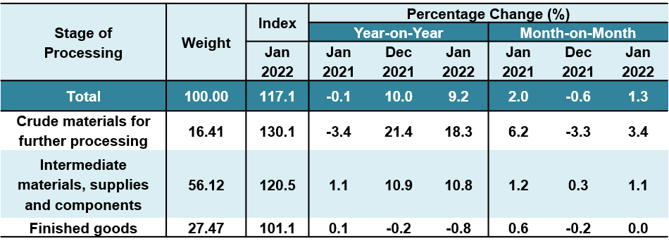 The index of Crude materials for further processing increased 18.3 per cent in January 2022 as opposed to a decrease of 3.4 per cent recorded in the same month of the preceding year due to the increase in primary commodities prices. The indices of Non-food materials and Foodstuffs & feedstuffs increased 20.9 per cent and 5.4 per cent respectively. Similarly, the index of Intermediate materials, supplies & components rose 10.8 per cent supported by the increase in the indices of Processed fuel & lubricants (17.7%) and Materials & components for manufacturing (11.4%). Among the products that also contributed to the increase were Liquefied Natural Gas (LNG), Crude palm oil, Naphtha, Integrated Circuits and Aluminium. However, the index of Finished goods decreased 0.8 per cent due to a decrease in the index of Capital equipment (-2.7%).