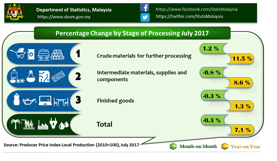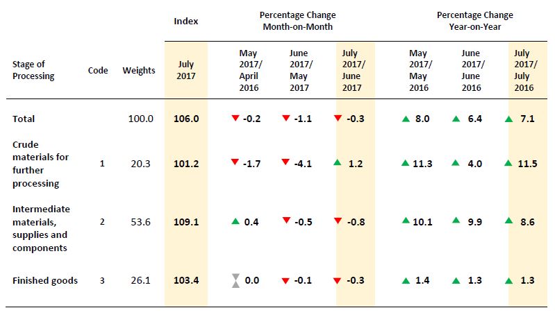 The PPI for local production by stage of processing (SOP) decreased by 0.3 per cent in July 2017 compared to the previous month. This decline was due to decreases in the indices for intermediate materials, supplies and components (-0.8%) and Finished goods (-0.3%). However, index for Crude materials for further processing increased by (+1.2%).