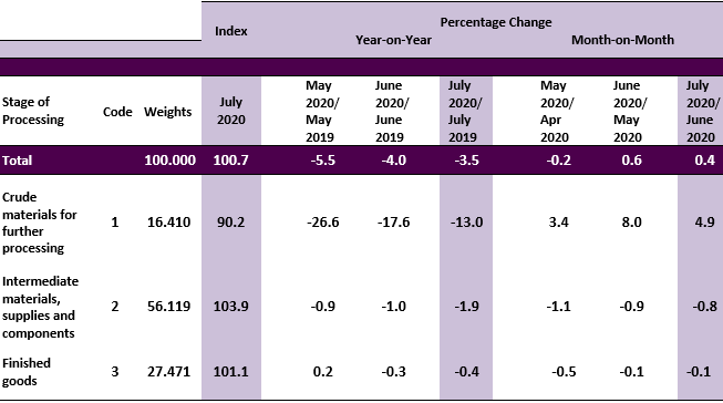 As compared with the same month a year ago, the PPI local production by stage of processing (SOP) declined 3.5 per cent in July 2020. It was led by the decline of all stage of processing; Crude materials for further processing (-13.0%), Intermediate materials, supplies & components (-1.9%) and Finished goods (-0.4%).