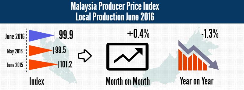 As compared with the same month a year ago, the PPI for local production by SOP for June 2016 dropped by 1.3 per cent. This was due to decreases in index for Intermediate materials, supplies and components (-2.7%). However, index for Finished goods increased by 0.7 per cent followed by index for Crude materials for further processing (+0.2%).