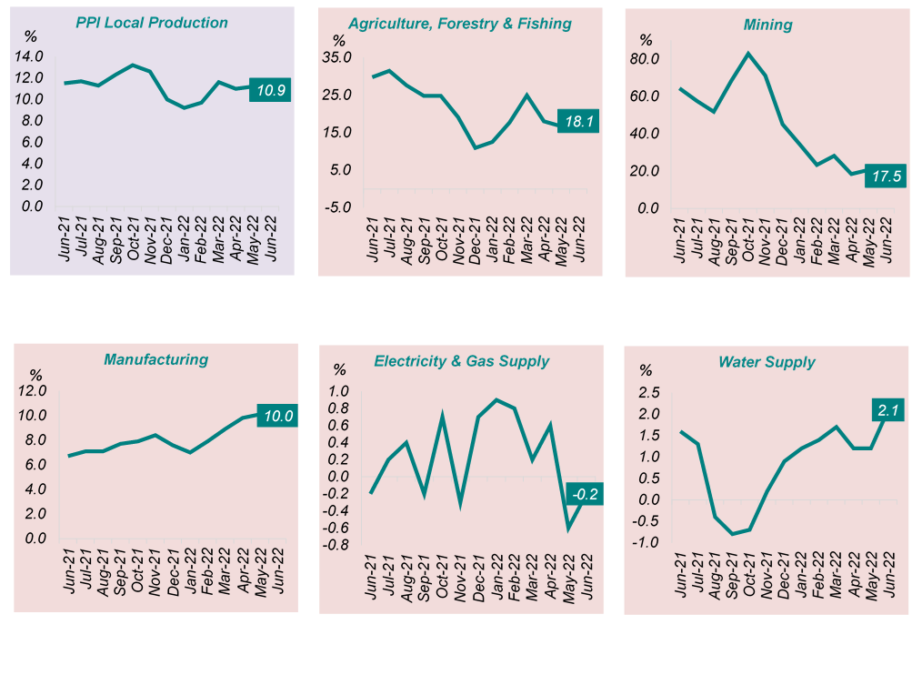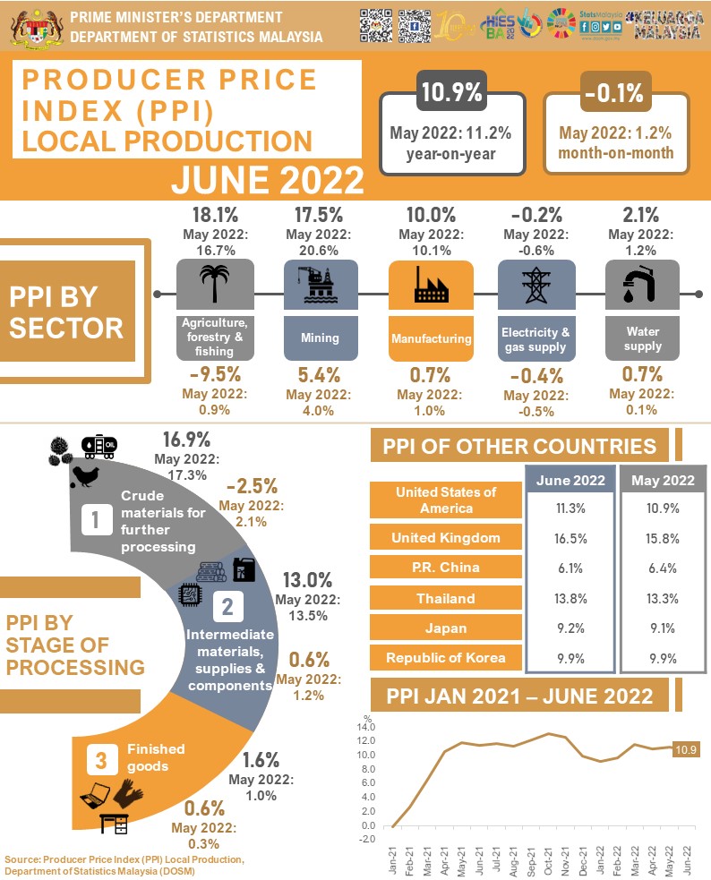 In terms of month-on-month comparison, the PPI local production in June 2022 declined for the first time this year, to record a negative 0.1 per cent as against a 1.2 per cent increase posted in May 2022. The decrease was contributed by Agriculture, forestry & fishing index that registered a 9.5 per cent decline (May 2022: 0.9%), underpinned by a decrease in Oil palm fresh fruit bunches index (-14.3%). On the other hand, Mining index increased 5.4 per cent (May 2022: 4.0%) attributed by the rise in the indices of Crude oil (5.9%) and Natural gas (3.2%). Similarly, Manufacturing index increased at a slower rate of 0.7 per cent as compared to 1.0 per cent recorded in May 2022. The incline was due to the increase in indices of sub-sectors namely Manufacture of refined petroleum products (1.8%), Manufacture of electronic components & boards (1.2%) and Manufacture of basic chemicals, fertilisers & nitrogen compounds, plastics & synthetic rubber in primary forms (1.2%). However, the incline was also offset by the decline in indices of Manufacture of vegetable & animal oils & fats (-0.3%) and Manufacture of basic iron & steel (-0.2%). Water supply index increased 0.7 per cent, while, Electricity & gas supply index decreased 0.4 per cent.