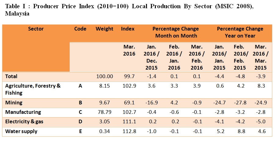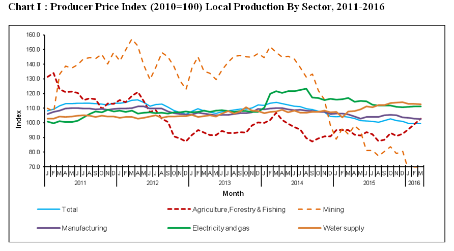 The PPI for local production inclined by 0.1 per cent in March 2016 as compared to February 2016. This was due to increases in Agriculture, forestry & fishing (+3.9%). Meanwhile, the index for Mining decreased (-0.9%), followed by Manufacturing (-0.1%), Electricity & gas (-0.1%) and Water supply 0.1 per cent.
