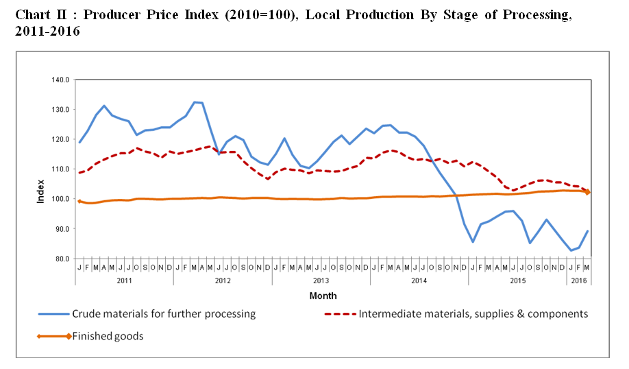 As compared with the same month a year ago, the PPI for local production by SOP for March 2016 dropped by 3.9 per cent. This was due to decreases in index for Crude materials for further processing (-3.5%), followed by index for Intermediate materials, supplies and components (-6.2%). However, index for Finished goods increased by 0.7 per cent.