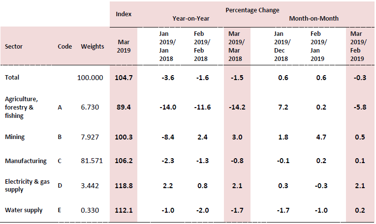 The Producer Price Index (PPI) local production decreased 1.5 per cent in March 2019 as compared to the same month of the preceding year. The sectors which decreased during this month were Agriculture, forestry & fishing (-14.2%), Water supply (-1.7%) and Manufacturing (-0.8%). Meanwhile, the index of Mining and Electricity & gas supply increased 3.0 per cent and 2.1 per cent respectively.
