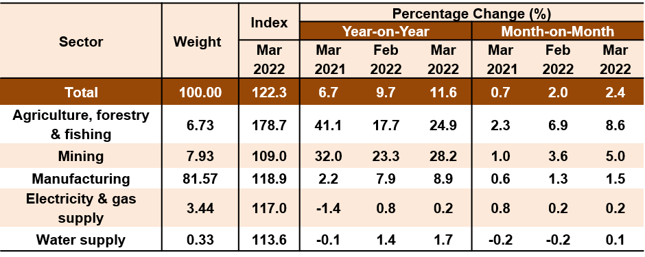 The Producer Price Index (PPI) local production which measures the costs of goods at factory gate recorded a two-digit increase for the first time this year with 11.6 per cent in March 2022 as compared to 9.7 per cent posted in February 2022. The increase in the PPI local production in March 2022 was driven by Mining index that rose 28.2 per cent as opposed to 23.3 per cent recorded in February 2022. Index of Agriculture, forestry & fishing registered a higher increase of 24.9 per cent (February 2022: 17.7%) mainly led by an increase in indices of Growing of perennial crops (33.4%), Fishing (6.5%) and Animal production (5.5%). Similarly, Manufacturing index increased 8.9 per cent as compared to 7.9 per cent posted in February 2022, supported by an increase in indices of subsectors namely Manufacture of refined petroleum products (22.7%), Manufacture of vegetable & animal oils & fats (20.8%) and Manufacture of basic chemicals, fertilizers & nitrogen compounds, plastics & synthetic rubber in primary forms (13.3%). In addition, the indices of Water supply and Electricity & gas supply increased 1.7 per cent and 0.2 per cent respectively.