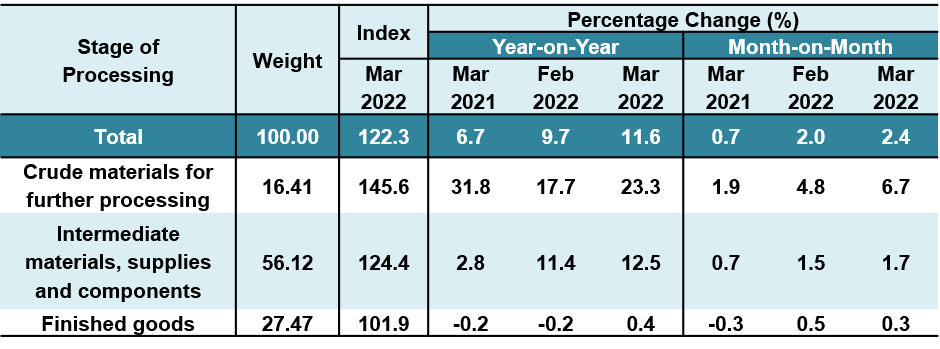 For a monthly comparison, index of Crude materials for further processing increased 6.7 percent as compared to 4.8 per cent recorded in February 2022. Index of Intermediate materials, supplies & components edged up 1.7 per cent, while Finished goods index rose slowly 0.3 per cent.