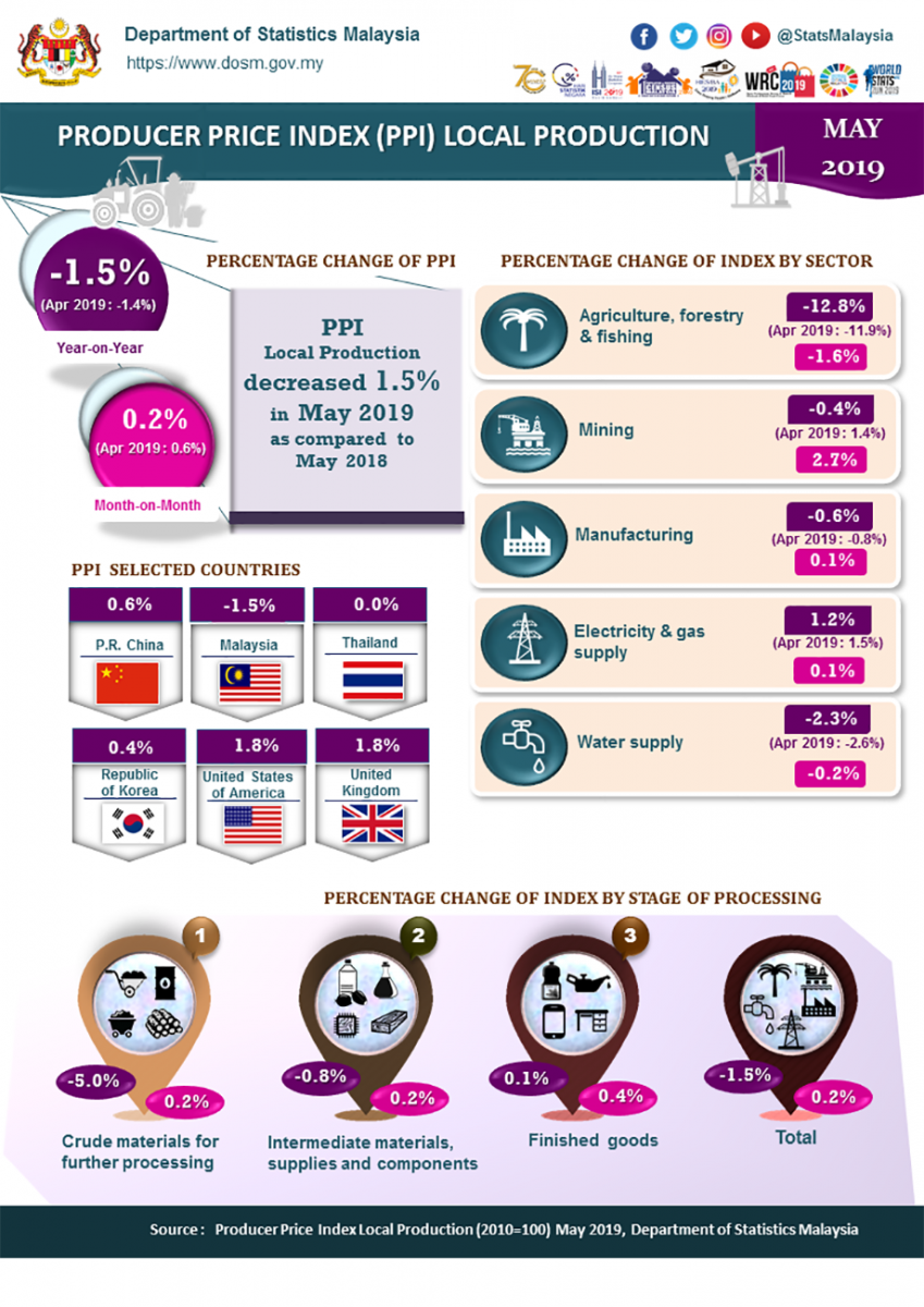 In May 2019, the PPI local production by stage of processing (SOP) declined 1.5 per cent. The decreased was attributed by Crude materials for further processing (-5.0%) and Intermediate materials, supplies and components (-0.8%). Conversely, the index for Finished goods rose 0.1 per cent.