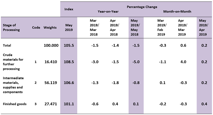 On monthly basis, the PPI local production by SOP for May 2019 increased 0.2 per cent. This was due to the index for Finished goods (+0.4%), Intermediate materials, supplies & components (+0.2%) and Crude materials for further processing (+0.2%).