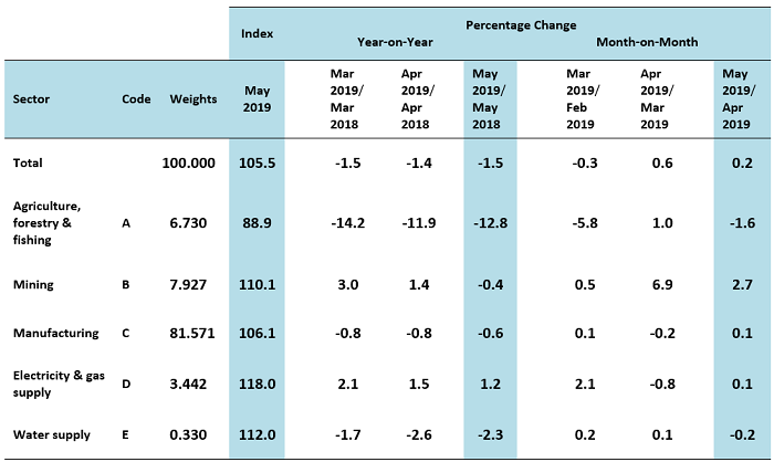 The Producer Price Index (PPI) local production decreased 1.5 per cent in May 2019 as compared to the same month of the preceding year. The sectors which decreased during this month were Agriculture, forestry & fishing (-12.8%), Water supply (-2.3%), Manufacturing (-0.6%) and Mining (-0.4%). However, the index of Electricity & gas supply increased 1.2 per cent.