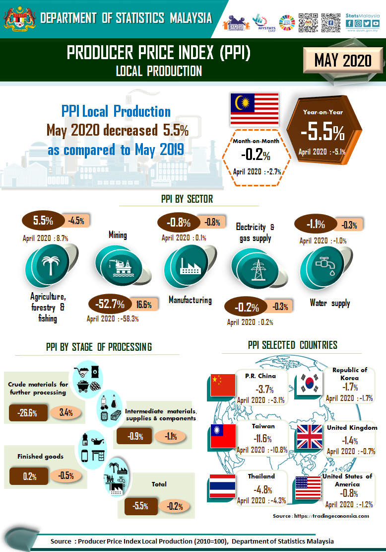As compared to the previous month, the PPI local production decreased marginally by 0.2 per cent in May 2020. The decrease was attributed by the index for Intermediate materials, supplies & components (-1.1%) and Finished goods (-0.5%). Meanwhile, Crude materials for further processing rose 3.4 per cent. [Table 2]